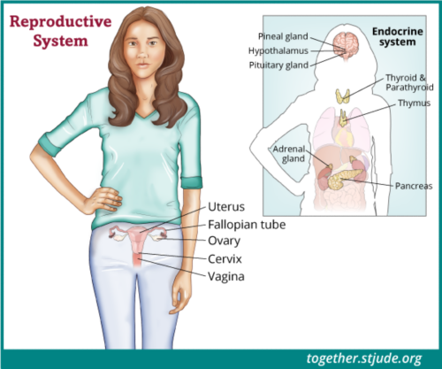 The female reproductive system includes the ovaries, fallopian tubes, uterus, vagina, vulva, mammary glands and breasts.